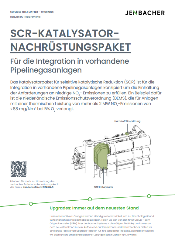 Das Katalysatorpaket für selektive katalytische Reduktion (SCR) ist für die Integration in vorhandene Pipelinegasanlagen konzipiert um die Einhaltung der Anforderungen an niedrige NOx- Emissionen zu erfüllen. Ein Beispiel dafür ist die niederländische Emissionsschutzverordnung (BEMS), die für Anlagen mit einer thermischen Leistung von mehr als 2 MW NOx-Emissionen von <<88 mg/Nm3 bei 5% O2 verlangt.