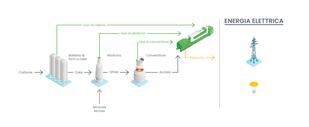Oltre ai benefici economici che forniscono questi gas, il loro impiego come combustibile per motori, riduce le emissioni industriali di CO2 e salvaguarda le fonti di energia naturali. Jenbacher offre motori a gas appositamente modificati che usano in modo efficiente tre diversi gas siderurgici, cioè il gas di cokeria, il gas di altoforno e il gas di convertitore; questi motori consentono la generazione combinata di calore ed elettricità, gestendo al contempo le diverse composizioni dei gas.