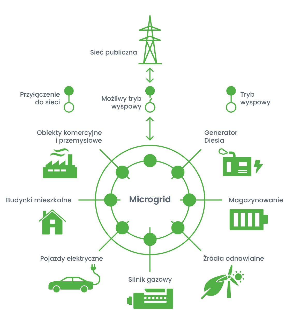 - Dawniej mikrosieci wykorzystywano przede wszystkim do dostępu do zewnętrznej sieci zasilania i zasilania awaryjnego. Obecnie i w perspektywie przyszłości zyskają na znaczeniu jako rozwiązania zapewniające odporność i zrównoważone/oszczędne alternatywy dla publicznej sieci dystrybucyjnej.