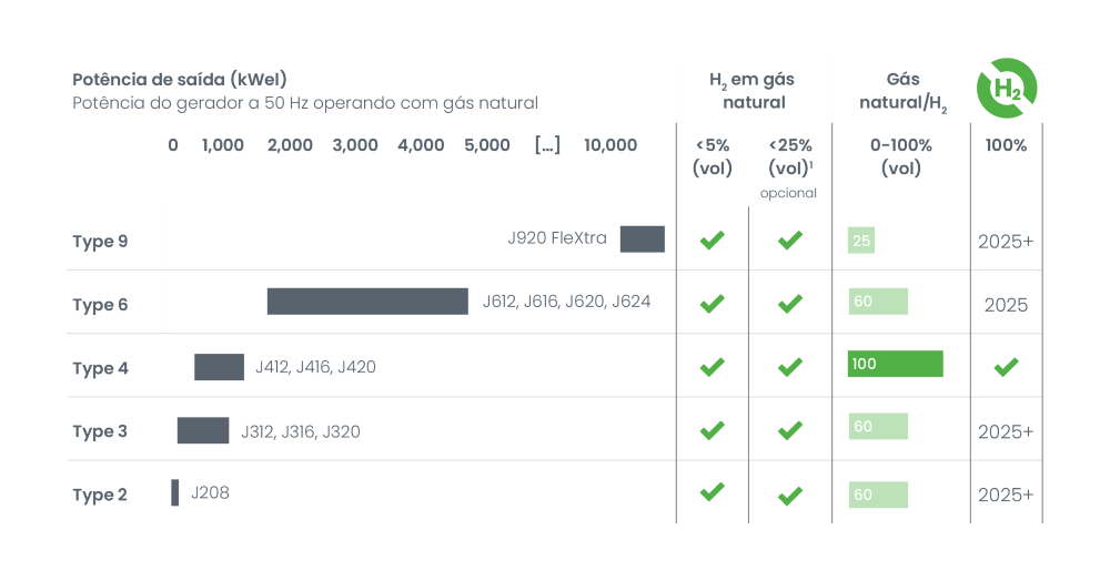 3 No geral, as unidades Jenbacher “Ready for H2” podem ser convertidas para uma operação com até 100% de hidrogênio no futuro. Os detalhes sobre o custo e a data para uma futura conversão podem variar e precisam ser esclarecidos individualmente.